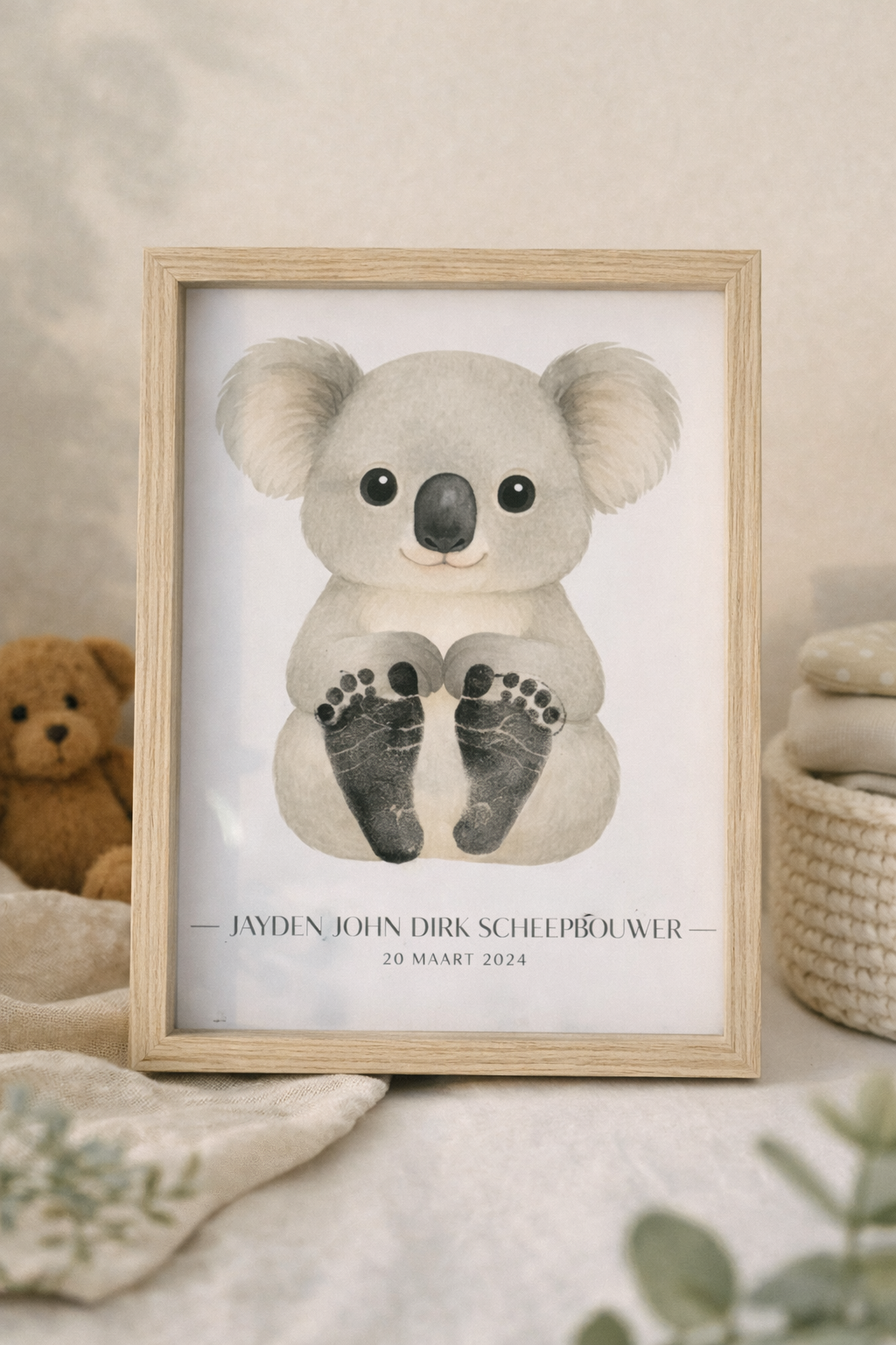 De poster bevat een zachte aquarelillustratie van een schattig diertje en wordt gepersonaliseerd met naam en geboortedatum. De echte voetafdrukjes van jullie baby maken het ontwerp extra bijzonder en persoonlijk. Zo ontstaat een waardevolle herinnering aan die allereerste, kleine voetjes.