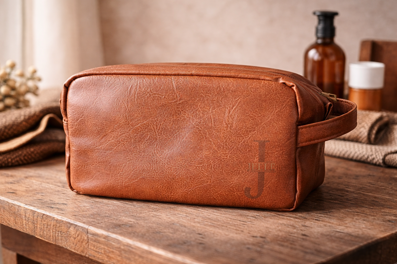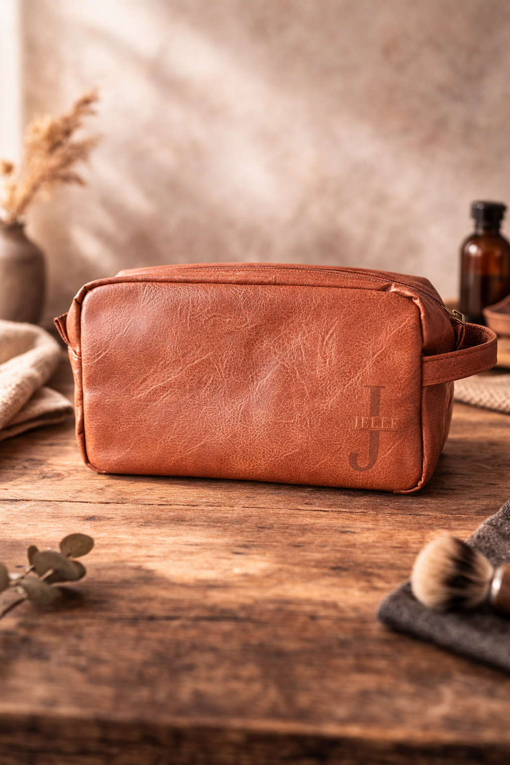 Deze gepersonaliseerde toilettas combineert een stoere uitstraling met een subtiele, zachte gravure. Een tijdloos ontwerp dat dagelijks gebruikt kan worden: thuis, op reis of tijdens een weekendje weg.